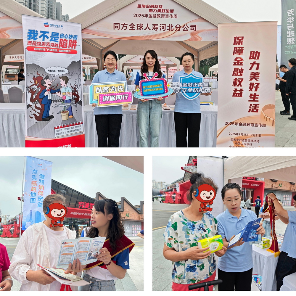为深刻把握金融工作政治性、人民性,积极践行以人民中心的价值取向,2025年9月16日,同方全球人寿河北分公司在石家庄市织音1953广场参与了以“保障金融权益 助力美好生活”为主题的集中宣教活动。此次活动由河北省银行业协会、河北省保险行业协会主办,80余银行保险机构参与,旨在提升社会公众金融素养,增强消费者风险防范意识,切实保护金融消费者合法权益。