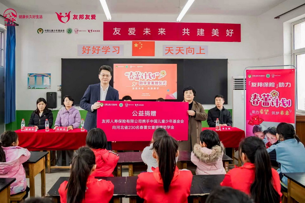 12月10日,河北友邦人寿保险有限公司河北分公司(以下简称“友邦河北”)携手中国儿童少年基金会(以下简称“中国儿基会”)、河北省妇女儿童发展基金会、唐山市及丰润区妇联、教育局等部门在唐山市丰润区左家坞镇大旺庄小学举办“春蕾计划”助学金发放仪式,用于支持河北省230 名春蕾女童小学阶段生活补助。