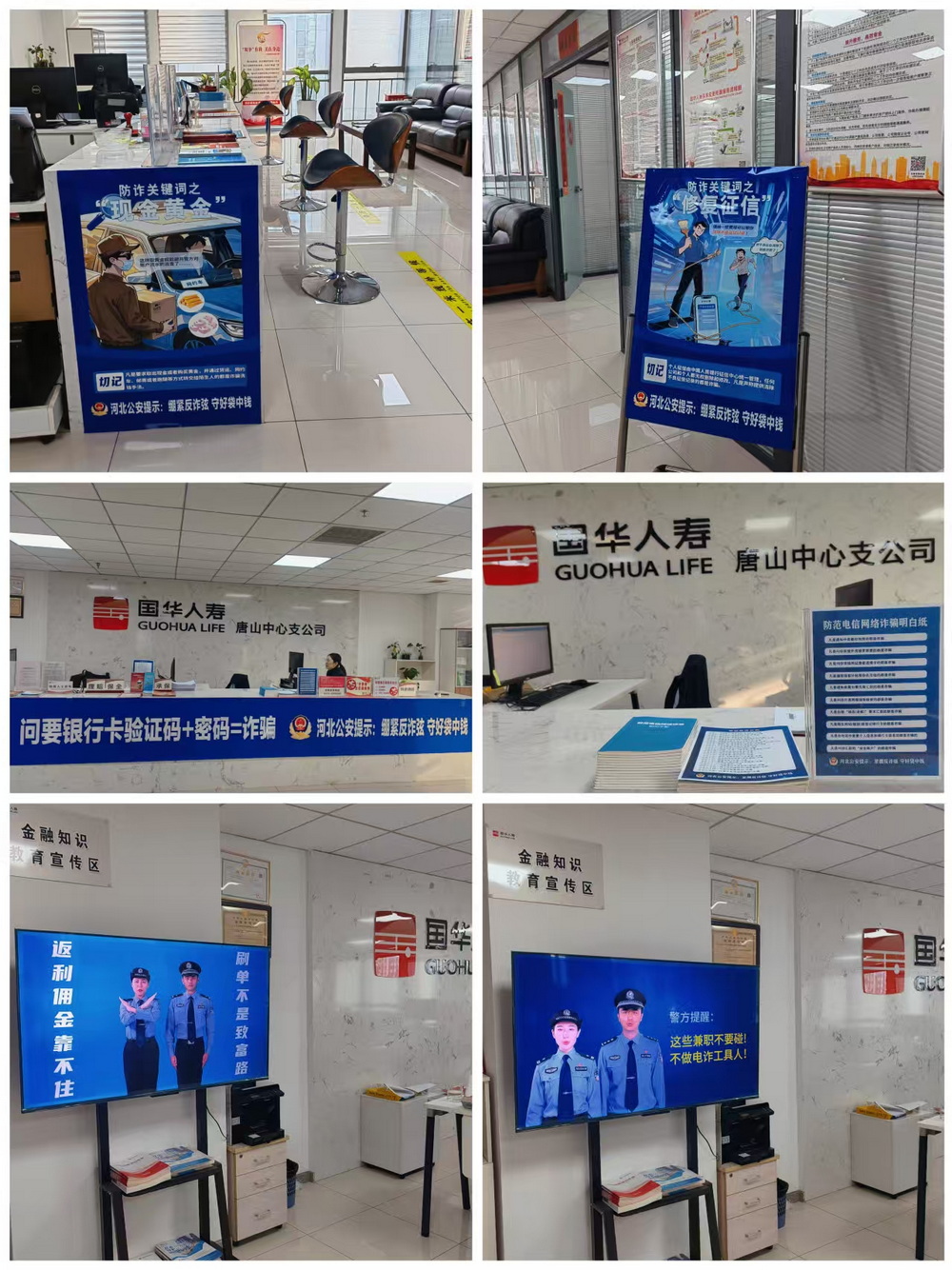 为深入贯彻落实全省打击治理电信网络诈骗犯罪工作部署及监管部门相关工作要求,切实发挥职场宣传阵地作用,提升广大群众及员工的反诈意识和防骗能力,国华人寿唐山中支公司高度重视反诈宣防工作,迅速行动,全面完成反诈宣防职场布置工作。